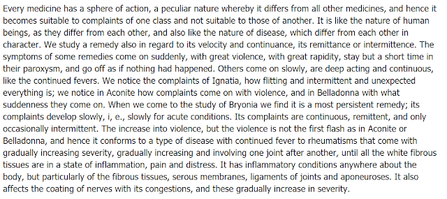 Because the lecture is on Bryonia, and the only remedies mentioned in the Introduction are Aconite, Belladonna and Ignatia along with discussion about peculiarity of each remedy, we are now prepared to see how Bryonia is similar or different from the remedies mentioned. We cleared up imaginary shelf in our mind for Bryonia's specific characteristics. For more examples of breaking up old text with short explanations of each paragraph, read next post on Study of Bryonia.* I highly recommend you to refer to this article for discussion of the terms "remittance" and "intermittence":